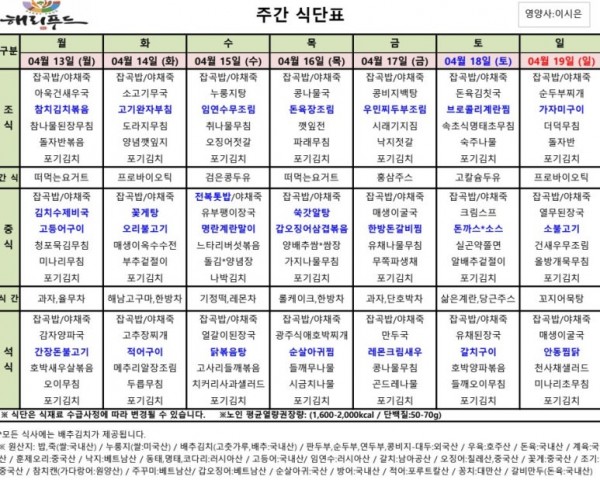 4월 둘째주 식단표 페이지 정보 작성자 은천노인복지회 작성일26-04-14 14:54 조회133회 댓글0건 관련링크 이전글 다음글 목록 답변 본문 4월 둘째주 어르신 식단표 안내해 드립니다. 정성과 영양을 담아 준비하겠습니다. 이전글 다음글 목록 답변