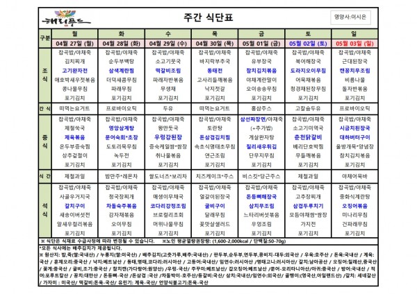 4월 넷째주 식단표 페이지 정보 작성자 은천노인복지회 작성일26-04-27 17:08 조회87회 댓글0건 관련링크 다음글 목록 답변 본문 4월 넷째주 어르신 식단표 안내해 드립니다. 정성과 영양을 담아 준비하겠습니다. 다음글 목록 답변