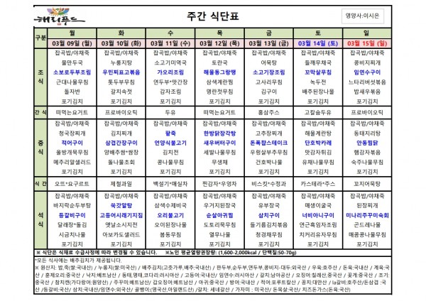 3월 둘째주 식단표 페이지 정보 작성자 은천노인복지회 작성일26-03-06 15:04 조회1,581회 댓글0건 관련링크 이전글 다음글 목록 답변 본문 3월 둘째주 어르신 식단표 안내해 드립니다. 정성과 영양을 담아 준비하겠습니다. 이전글 다음글 목록 답변