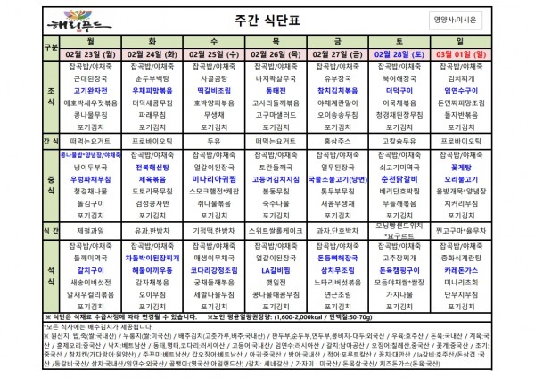 2월 넷째주 식단표 페이지 정보 작성자 은천노인복지회 작성일26-02-20 16:17 조회2,623회 댓글0건 관련링크 이전글 다음글 목록 답변 본문 2월 넷째주 어르신 식단표 안내해 드립니다. 정성과 영양을 담아 준비하겠습니다. 이전글 다음글 목록 답변